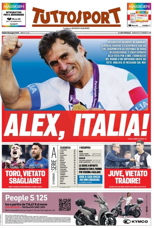 Si parla soprattutto di Zanardi sulla prima pagina di Tuttosport in edicola questa mattina. "Alex, Italia!", titola il noto quotidiano sportivo, che poi aggiunge: "Spaventoso incidente in handbike a Pienza: Zanardi s’è scontrato con un tir. Trasportato all’ospedale di Siena in elisoccorso, è stato operato alla testa per 3 ore. L’abbraccio del mondo a un Superman amato da tutti: migliaia di messaggi sul web".