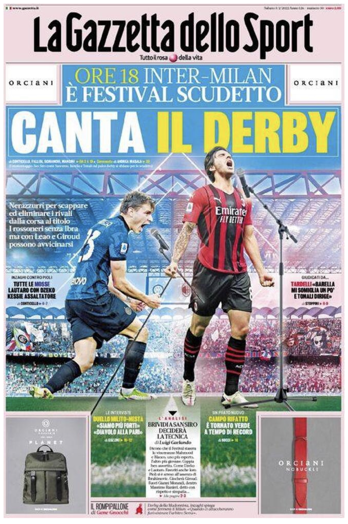 La Gazzetta dello Sport in edicola questa mattina dedica l’intera prima pagina al big match in programma alle 18 a San Siro. “Canta il derby”, titola la rosea, che poi aggiunge: “Inter-Milan, è festival Scudetto. Nerazzurri per scappare ed eliminare i rivali dalla corsa al titolo. I rossoneri senza Ibra, ma con Leao e Giroud possono avvicinarsi”.