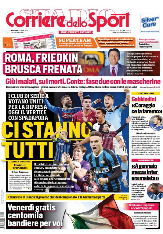 "Ci stanno tutti!", titola il Corriere dello Sport oggi in edicola a proposito della votazione dei club della massima serie al termine dell'assemblea di Lega di ieri pomeriggio, in cui all'unanimità si è votato per la ripresa del campionato. Oggi il vertice con il Ministro dello Sport Vincenzo Spadafora. I club hanno trovato unità di fronte al rischio di un contenzioso con Sky sui diritti TV. La UEFA raccomanda alle cinque leghe principali di concludere la stagione, e detta le regole in caso di stop.