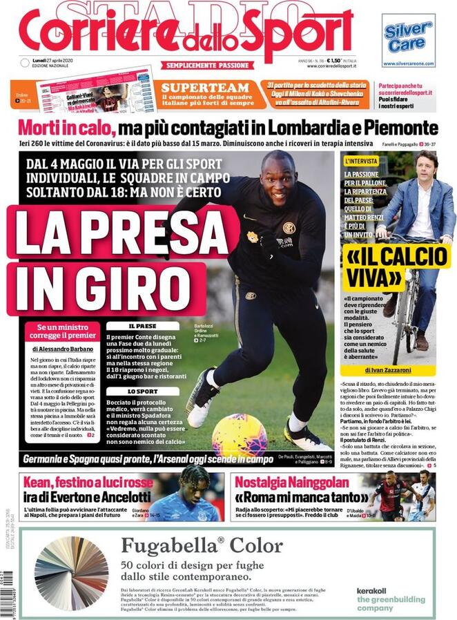 "La presa in giro": questa l'apertura odierna del Corriere dello Sport. Conferenza stampa di Conte per il nuovo DPCM. Dal 4 maggio il via agli sport individuali, le squadre in campo soltanto dal 18: ma non è certo. Il Premier Conte disegna una fase 2 per il Paese molto graduale. Per lo sport, bocciato il protocollo medico: verrà cambiato. Il Ministro Spadafora non regala alcuna certezza: "Vedremo, nulla è scontato ma non sono un nemico del calcio".