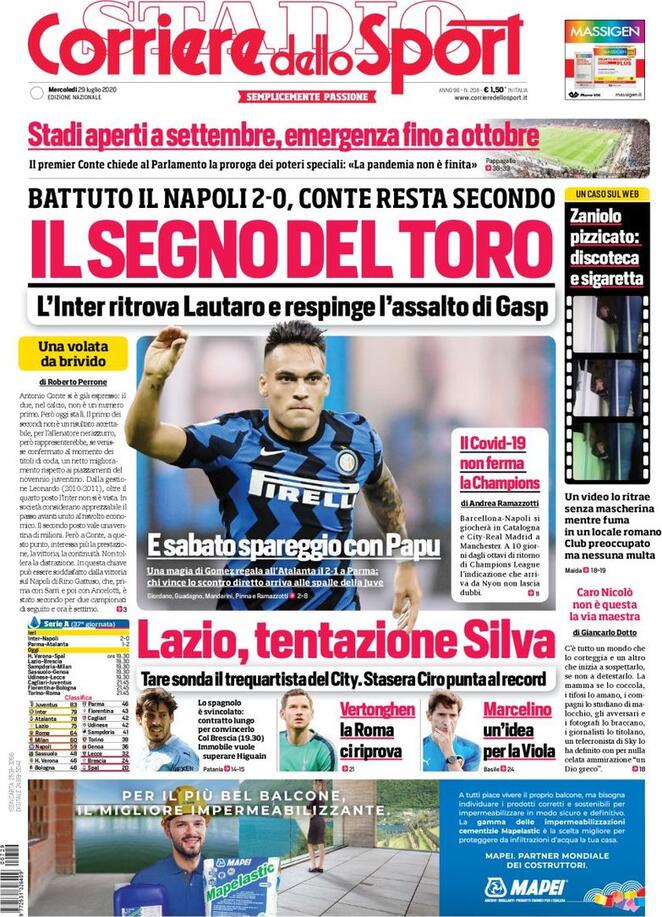 "Stadi aperti a settembre, emergenza fino a ottobre". Nel taglio alto della prima pagina del Corriere dello Sport si parla di politica e non solo. Il premier Conte chiede al Parlamento la proroga dei poteri speciali: "La pandemia non è finita". Intanto resta viva l'ipotesi di una parziale riapertura degli stadi a settembre.