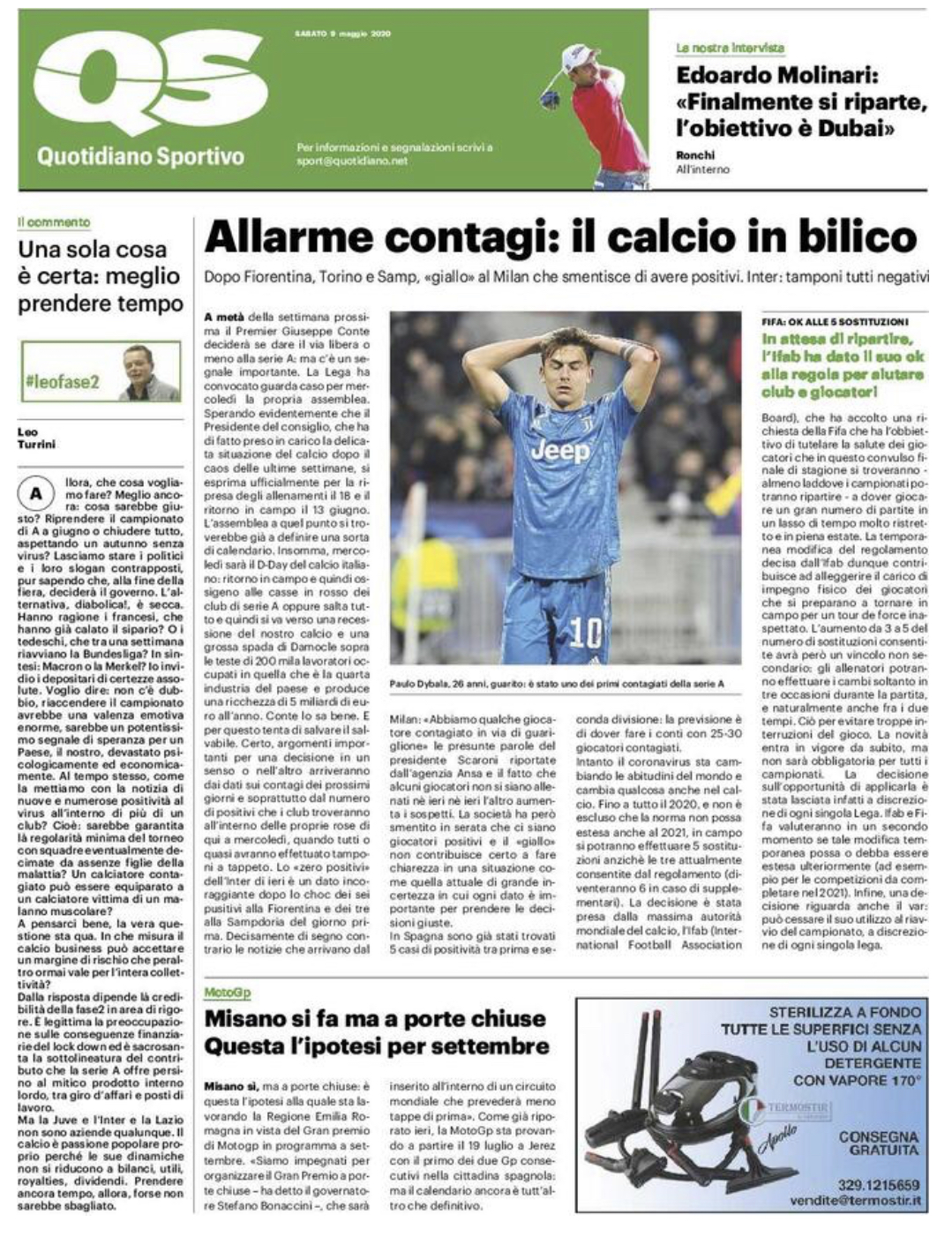 L'apertura del QS: "Allarme contagi: il calcio in bilico"