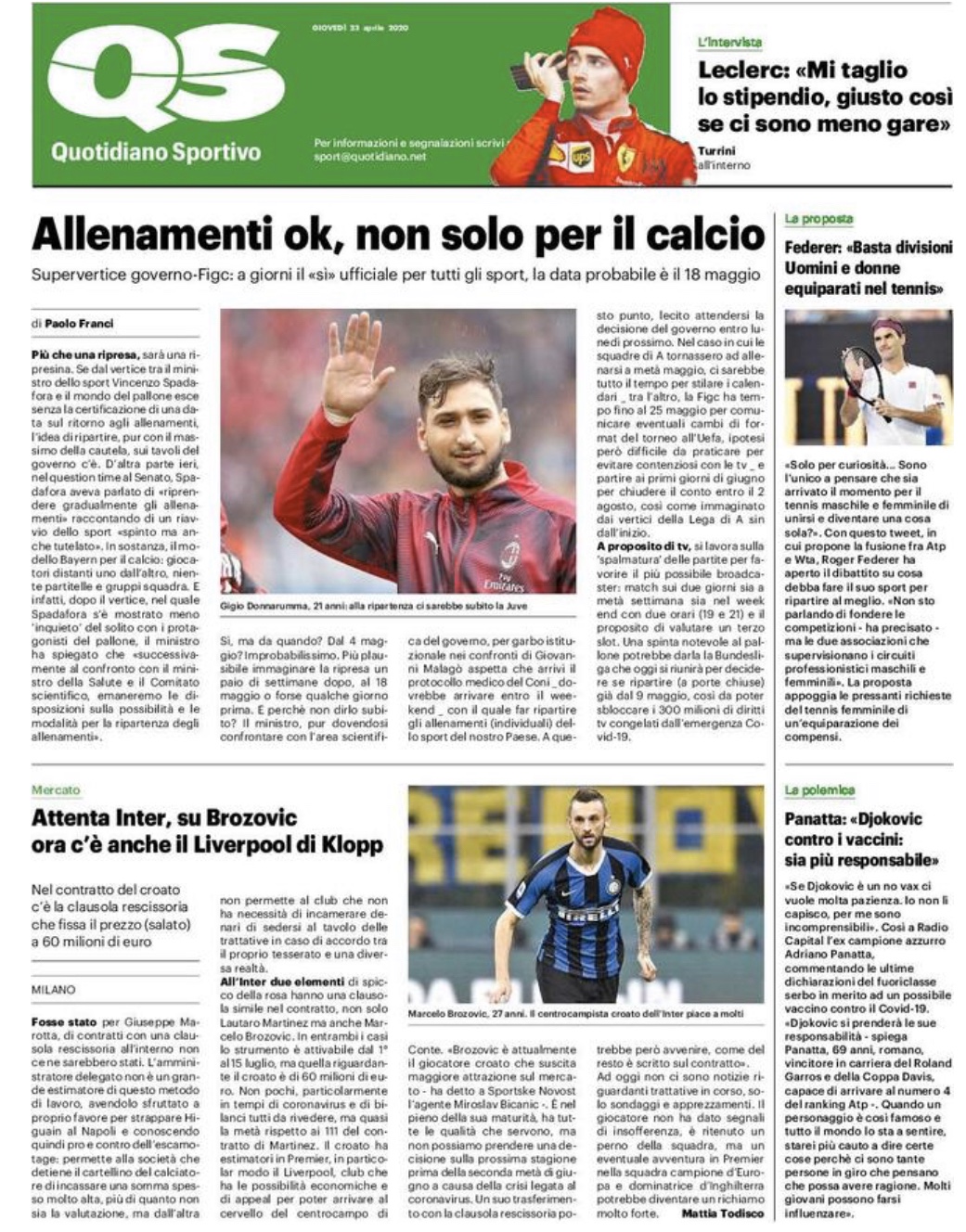 "Allenamenti ok, non solo per il calcio". Questo il titolo con cui si apre l'odierna edizione del QS in merito alla ripresa degli allenamenti: "Supervertice governo-Figc: a giorni il sì ufficiale per tutti gli sport, la data probabile è il 18 maggio".