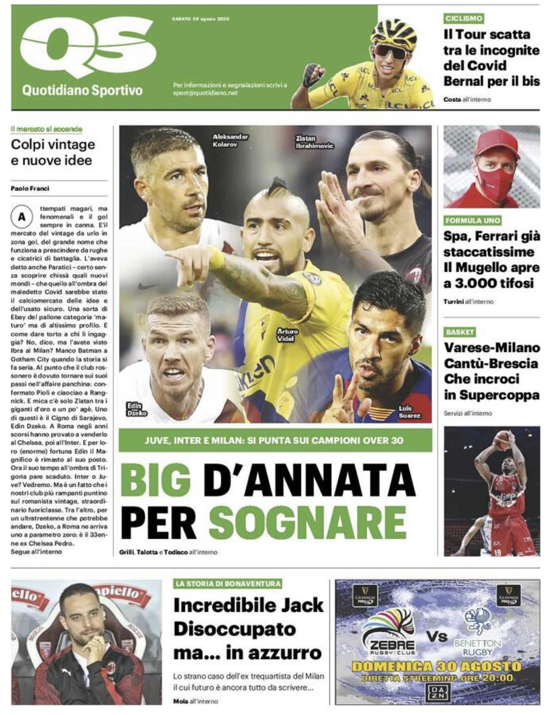 Ibrahimovic, Dzeko, Vidal, Kolarov... Le grandi del nostro campionato si affidano "all’usato sicuro". Non a caso, il QS in edicola questa mattina titola: "Big d’annata per sognare". Non solo giovani, dunque: Juventus, Inter e Milan puntano "sui campioni over 30", giocatori ancora in grado di fare la differenza sul campo e scaldare il cuore dei tifosi.
