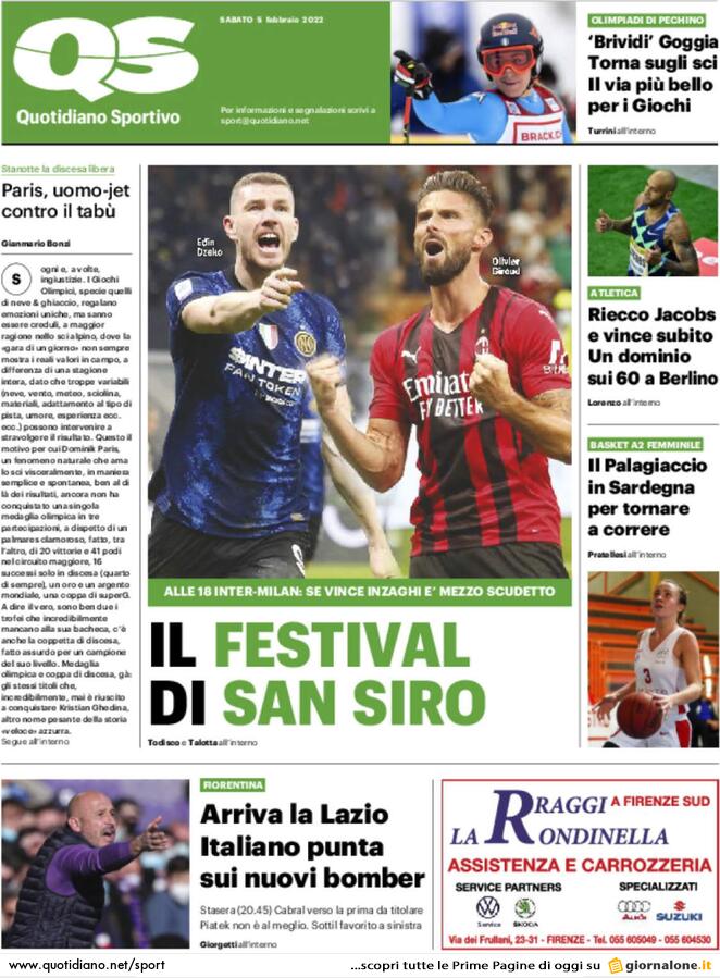 Il QS in edicola questa mattina dedica ampio spazio in prima pagina al match più atteso della 24esima giornata di campionato: la stracittadina di Milano. "Il festival di San Siro", titola il Quotidiano Sportivo, che poi aggiunge: "Alle 18 Inter-Milan: Se vince Inzaghi è mezzo Scudetto".