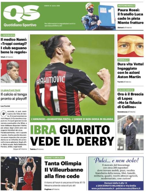 Il QS in edicola questa mattina riserva ampio spazio in prima pagina al Milan, o meglio, a Zlatan Ibrahimovic, che ieri - anticipando anche il club - ha annunciato la sua negatività al Coronavirus. "Ibra guarito vede il derby", titola il Quotidiano Sportivo, che poi aggiunge: "L’annuncio: 'Quarantena finita'. L’Under 21 non gioca in Islanda".