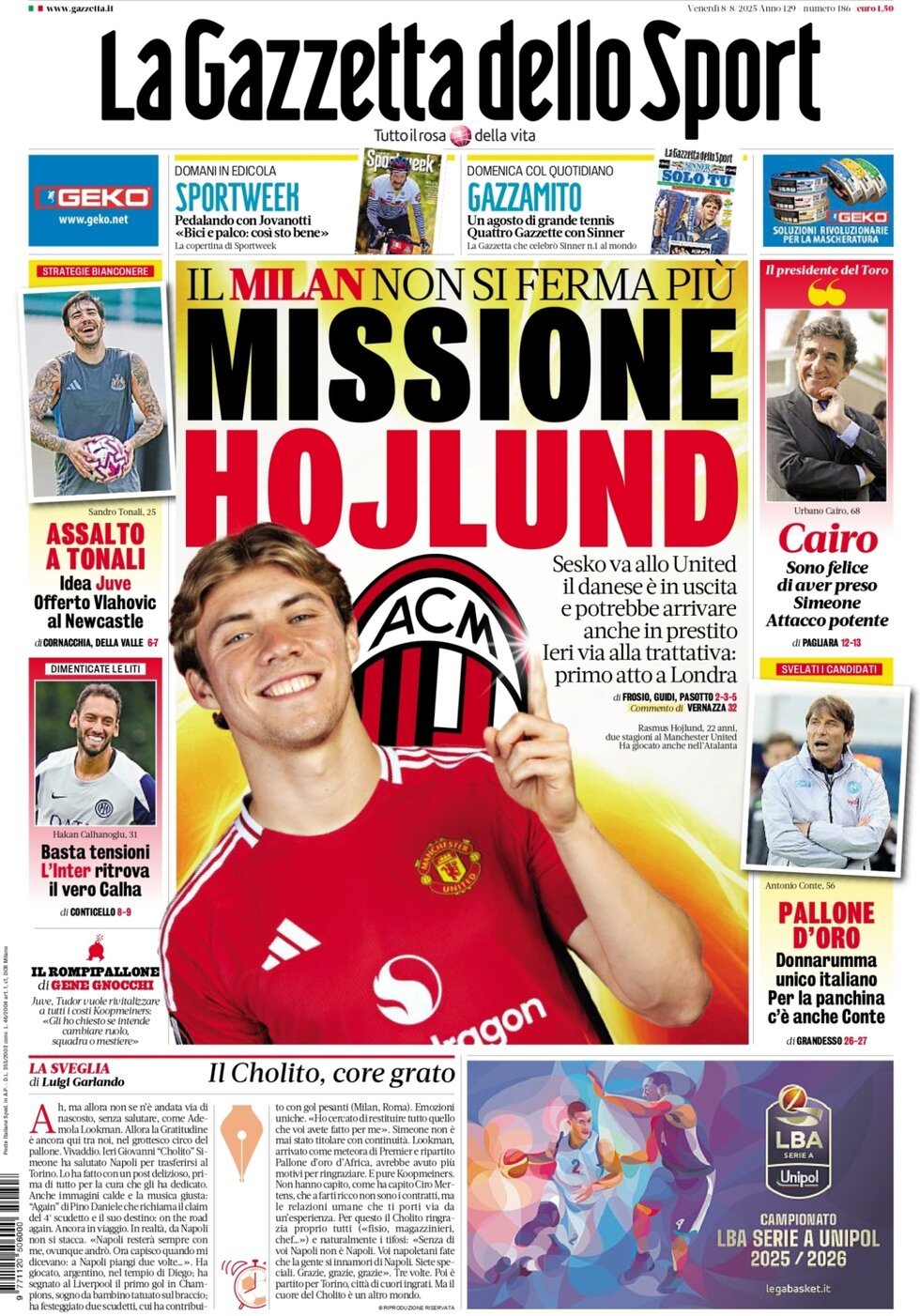 L'apertura della Gazzetta: "Missione Hojlund. Il Milan non si ferma più"