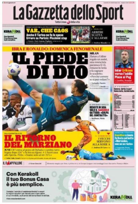 "Il piede di Dio". Questo il titolo di apertura in prima pagina de La Gazzetta dello Sport sul Milan e Ibrahimovic. Domenica fenomenale per Zlatan che a Udine regala un assist, una rovesciata pazzesca (2-1), rimane in testa e fa sognare lo scudetto: "Perché correre se si può volare?".