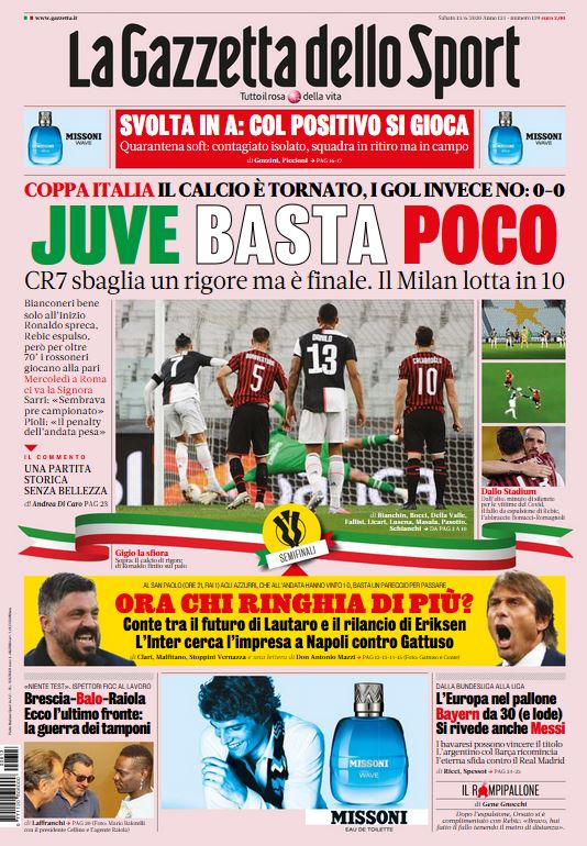 Anche La Gazzetta dello Sport apre con il pareggio (0-0) maturato ieri allo "Stadium" nel ritorno della semifinale di Coppa Italia, risultato che ha sancito l'eliminazione del Milan dalla competizione. "Juve basta poco", titola la rosea, che poi, sempre in prima pagina, aggiunge: "Bianconeri bene solo all’inizio. Ronaldo spreca, Rebic espulso, però per oltre 70’ i rossoneri giocano alla pari. Mercoledì a Roma ci va la Signora. Sarri: "Sembrava precampionato". Pioli: "Il penalty dell’andata pesa". Il calcio è tornato, i gol invece no".