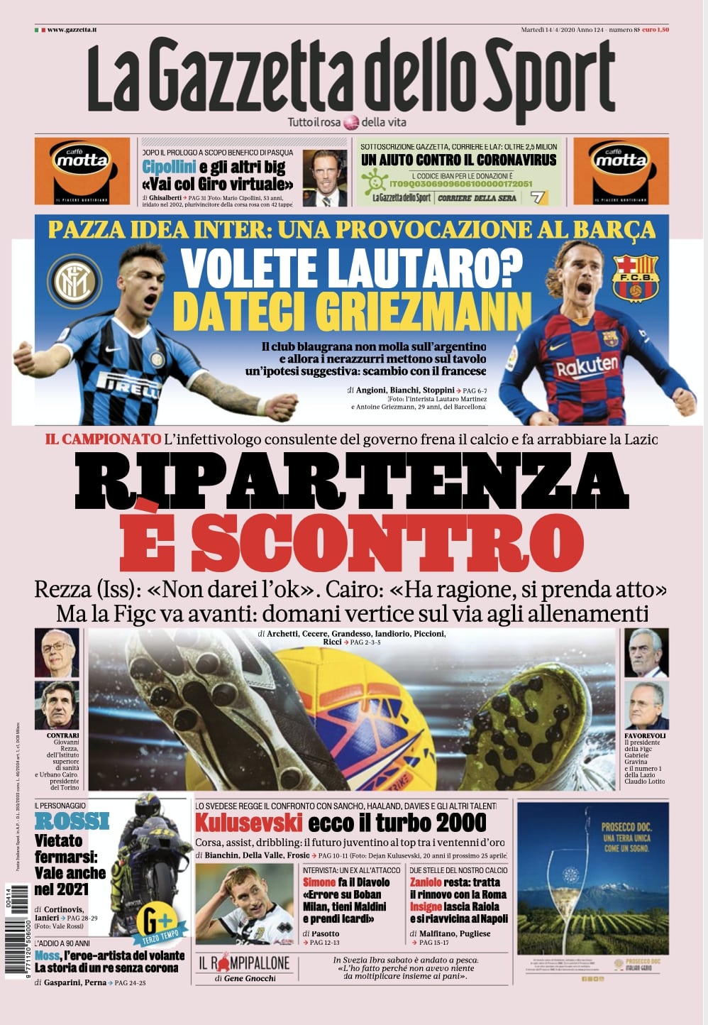"Ripartenza: è scontro". Così La Gazzetta dello Sport in apertura quest'oggi. L'infettivologo consulente del Governo - scrive la rosea in prima pagina - frena il calcio e fa arrabbiare la Lazio. Rezza (ISS): "Non darei l'ok". Cairo: "Ha ragione, si prenda atto". Ma la FIGC va avanti e come annunciato dal presidente Gravina domani ci sarà un vertice sul via agli allenamenti.