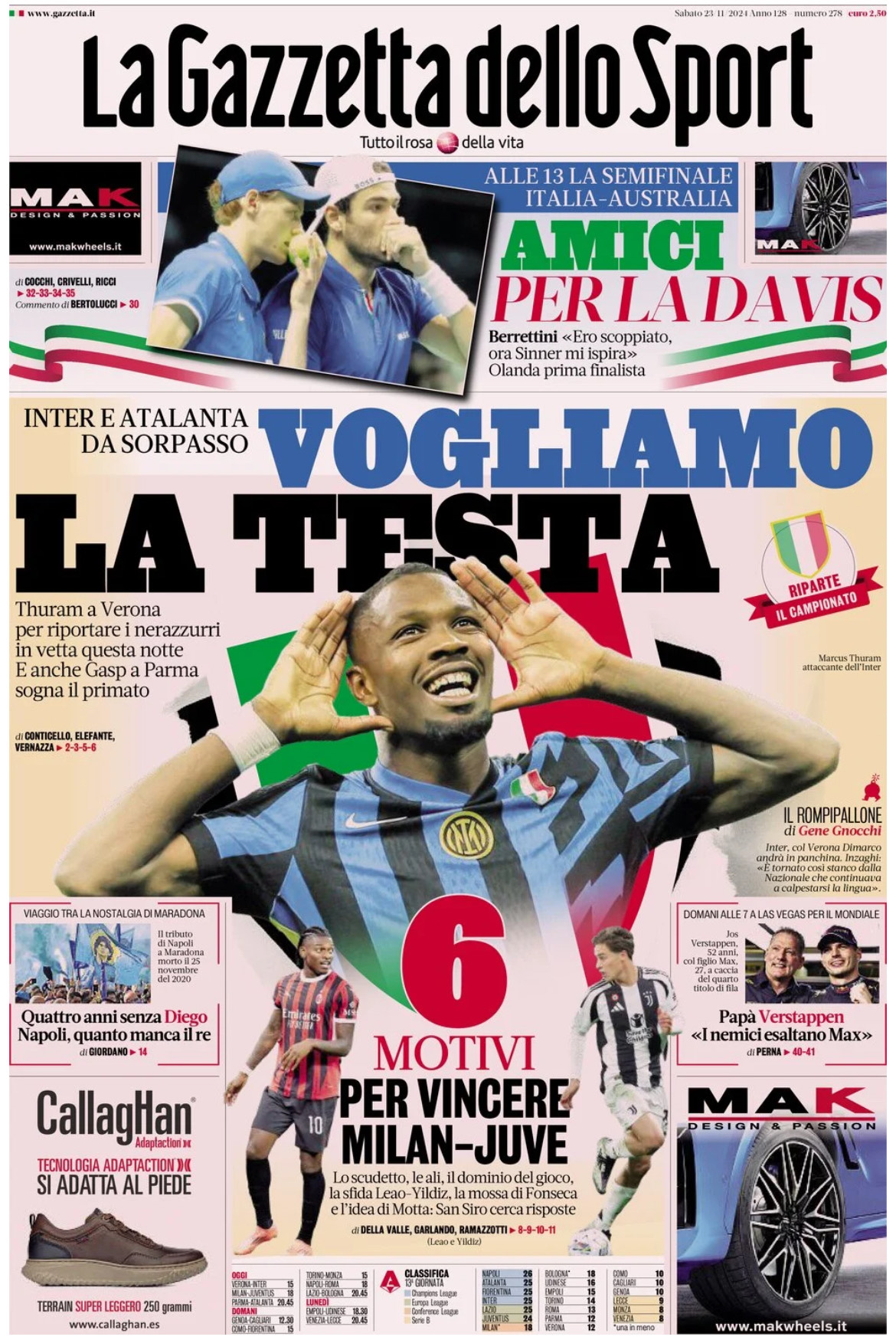 Sulla prima pagina odierna della Gazzetta dello Sport, questa mattina c'è spazio anche per il big match di questo pomeriggio (ore 18:00) tra Milan e Juventus. I padroni di casa, dopo il 3-3 raccolto nell'ultimo turno contro il Cagliari, vanno a caccia di un altra grande vittoria nei big match, come quest'anno è già accaduto contro Inter e Real Madrid; dall'altra parte Thiago Motta sarà in piena emergenza e dovrà fare a meno di Dusan Vlahovic, Nico Gonzalez e Douglas Luiz, oltre che ai luongodegenti Bremer, Milik e Cabal.