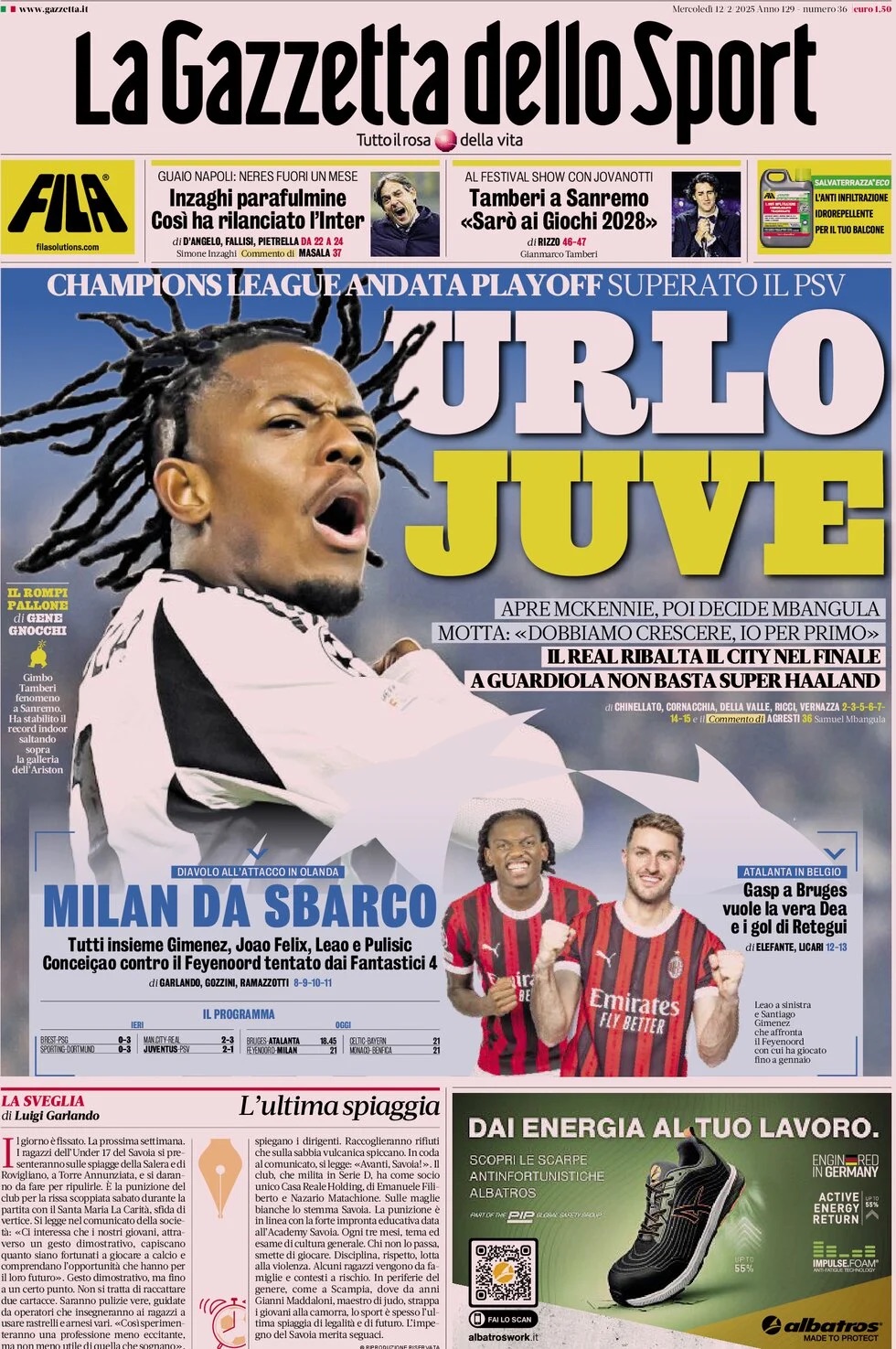 L'edizione odierna della Gazzetta dello Sport titola così questa mattina in prima pagina: "Milan da sbarco". Questa sera alle 21 a Rotterdam i rossoneri saranno impegnati contro il Feyenoord nella sfida di andata dei playoff di Champions League e Sergio Conceiçao dovrebbe schierare fin dal primo minuto le quattro punte, vale a dire Pulisic, Joao Felix, Gimenez e Leao.