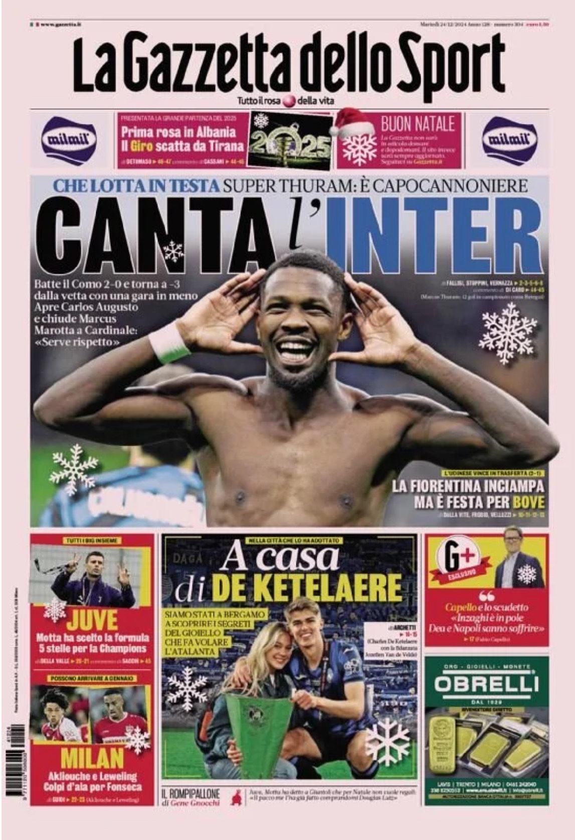 Spazio anche al mercato sulla prima pagina odierna della Gazzetta dello Sport, in particolare a quello del Milan: "Akliouche e Leweling, colpi d'ala per Fonseca". In vista del mercato invernale che inizierà tra qualche giorno, i rossoneri starebbe pensando di prendere un nuovo esterno offensivo al posto di uno tra Samuel Chukwueze e Noah Okafor che stanno deludendo parecchio. Lo svizzero è il principale indiziato e piace in Germania e in Inghilterra.