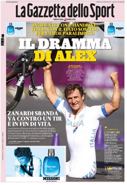 La Gazzetta dello Sport in edicola questa mattina dedica l’intera pagina - ed è giusto così - a Zanardi, vittima di un brutto incidente con la sua handbike. "Il dramma di Alex", titola la rosea, che poi aggiunge: "Sbanda, va contro un tir: è in fin di vita". Le condizioni dell’ex pilota di Formula 1, operato d'urgenza, sono gravissime: "Italia - scrive la Gazza - con il fiato sospeso per l’eroe paraolimpico".