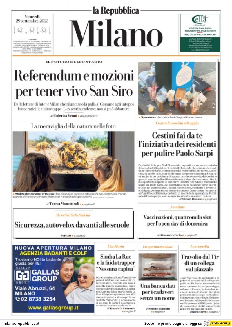 "Inter e Milan, referendum e mozioni per tener vivo San Siro" scrive La Repubblica Milano in apertura quest'oggi. In primo piano la questione relativa all'impianto milanese di San Siro. Dalle lettere di Inter e Milan che rilanciano la palla al Comune, agli intoppi burocratici: le ultime tappe. L'ex sovrintendente: "Non si può abbattere".