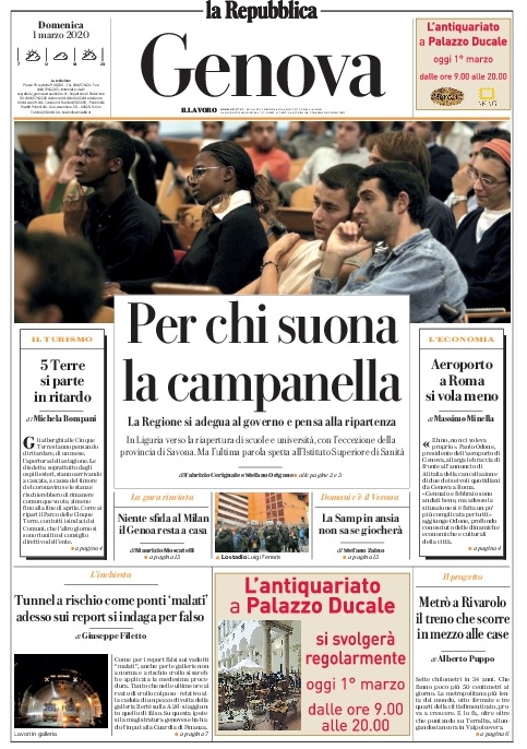L’edizione di Genova del quotidiano La Repubblica pone l’accento in prima pagina sul rinvio della gara di campionato in programma a San Siro. "Niente sfida al Milan, il Genoa resta a casa". La partita in questione - così come tutte quelle rimandate poiché erano previste a porte chiuse a causa dell’emergenza Coronavirus - si svolgerà il prossimo 13 maggio.