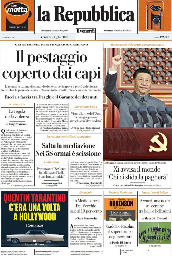 "Azzurri, una notte sul confine tra belli e bellissimi", titola stamani in taglio basso La Repubblica. È il giorno di Italia-Belgio: il match dell'Allianz Arena vale l'accesso alle semifinali di Euro 2020. Gli Azzurri sfidano Lukaku, in attesa del responso definitivo su Hazard e De Bruyne, che restano in dubbio dopo gli infortuni rimediati contro il Portogallo.