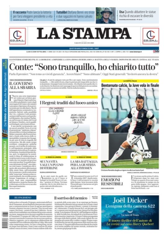 L'edizione odierna del quotidiano La Stampa riserva al calcio un'importante spazio in prima pagina, titolando: "Bentornato calcio, la Juve vola in finale". Non è stata una bella partita: zero gol, poche emozioni, tracce evidenti di stanchezza. Prevedibile, dopo tre mesi di stop. Comunque, per i calciofili in astinenza, è sufficiente: la sete di pallone viene comunque placata, tornano il gusto del gioco e il batticuore del risultato. Lo 0-0 di Torino premia la Juventus in virtù dell'1-1 dell'andata, le assegna la finale di Coppa Italia e la possibilità di inseguire il primo trofeo della stagione.