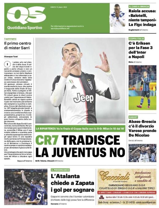 L’edizione odierna del QS dedica ampio spazio in prima pagina alla sfida di ieri tra i bianconeri di Sarri e i rossoneri di Pioli. "CR7 tradisce, la Juventus no", titola il Quotidiano Sportivo, che poi aggiunge, sempre a proposito della squadra juventina: "Va in finale di Coppa Italia con lo 0-0. Milan in dieci dal 16esimo".