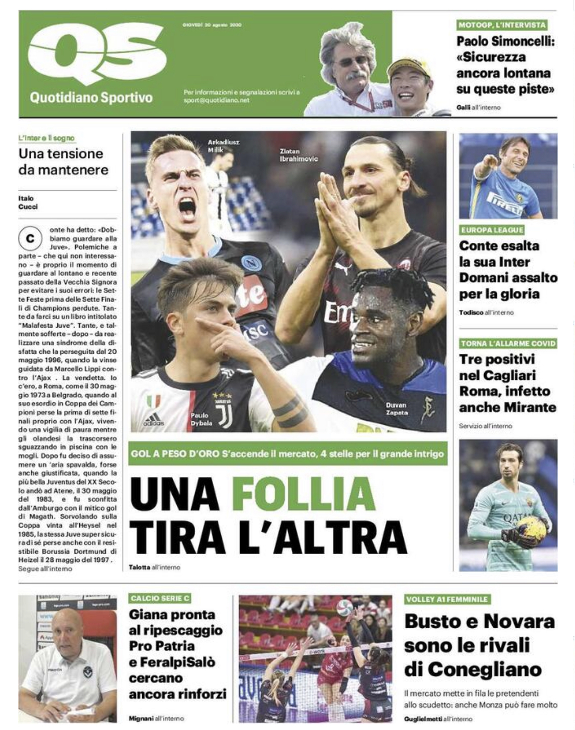 L’edizione odierna del QS dedica ampio spazio in prima pagina al calciomercato. "Una follia tira l’altra", titola il Quotidiano Sportivo, che poi aggiunge: "Gol a peso d’oro: s’accende il mercato, quattro stelle per il grande intrigo". Tra i giocatori in primo piano anche Ibrahimovic, il quale sta trattando il rinnovo del contratto con il Milan.