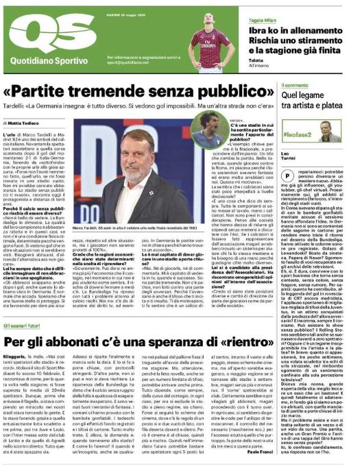 Anche l’edizione odierna del QS, nella sua apertura, pone l’accento sull’infortunio di Zlatan Ibrahimovic. "Tegola Milan. Ibra ko in allenamento", titola il Quotidiano Sportivo, che poi aggiunge in taglio alto: "Rischia uno stiramento e la stagione già finita". Rossoneri in ansia: gli esami a cui si sottoporrà lo svedese chiariranno la portata del problema fisico.