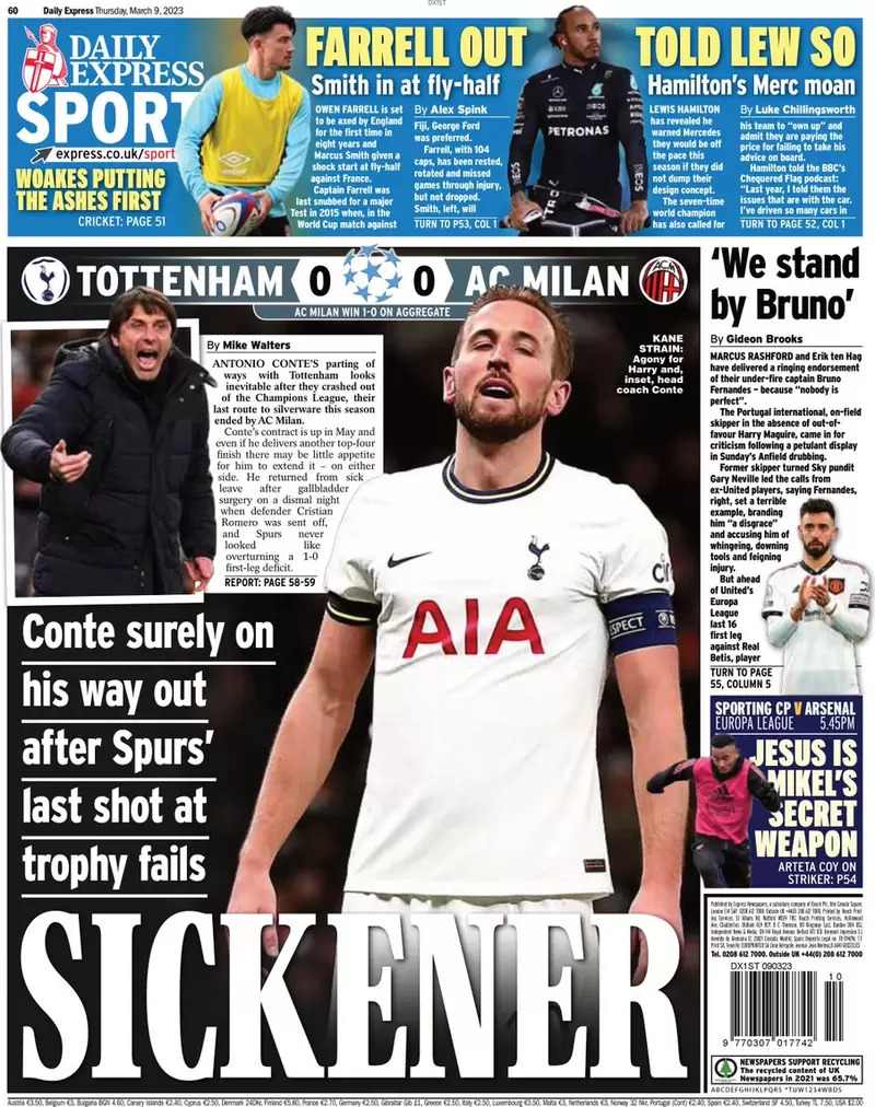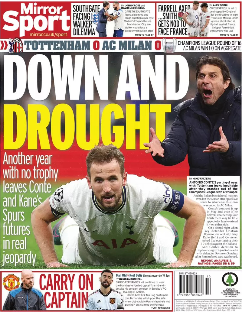 Altro giro, altro anno senza trofei per il Tottenham che, eliminato dalla Champions, ha visto svanire l'ultima possibilità di riempire una bacheca vuota da fin troppo tempo. Proprio su questo si sono concentrati i giornali britannici questa mattina. Il Daily Express Sport ha titolato: "Ammalati", il riferimento è a questa incapacità di riuscire a vincere qualcosa che, nel caso specifico di questa stagione, sembra allontanare Antonio Conte dagli Spurs. Il Mirror Sport invece recita: "Giù e a secco", il riferimento anche qui all'eliminazione e alla striscia di anni senza successi che, nel caso del Tottenham, è davvero molto lunga.