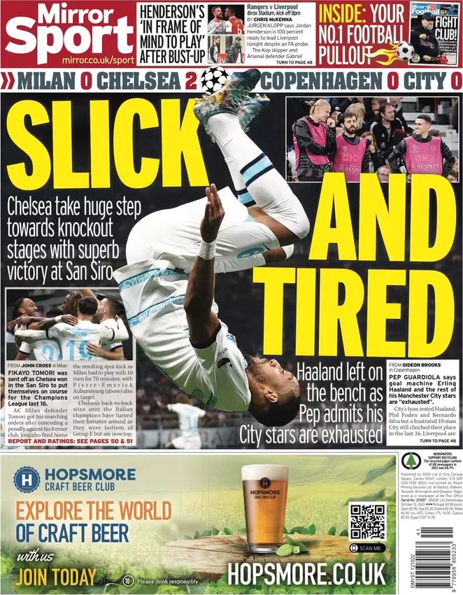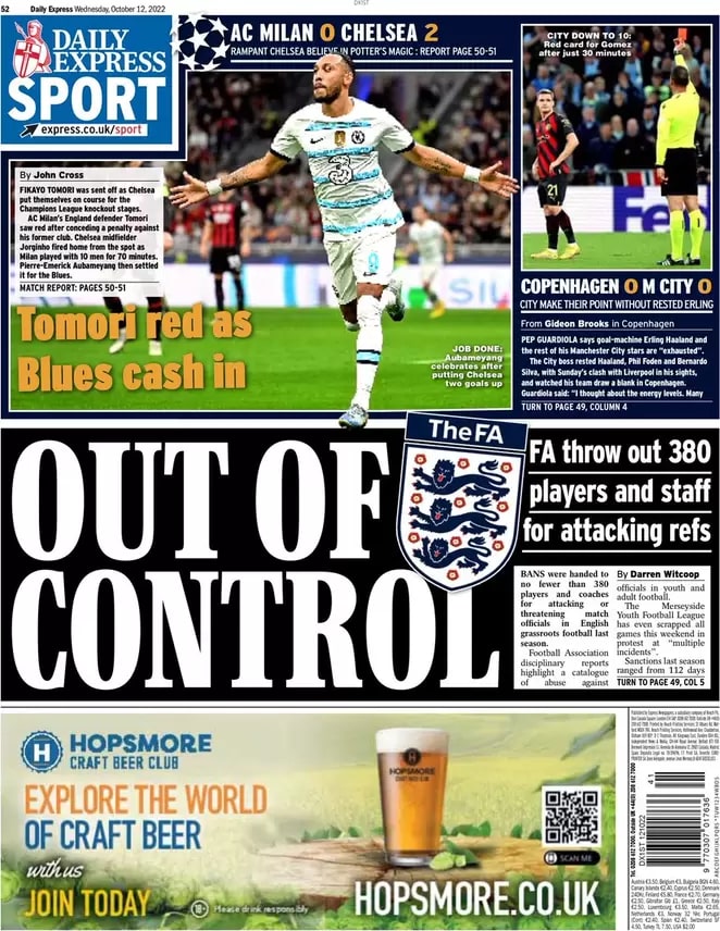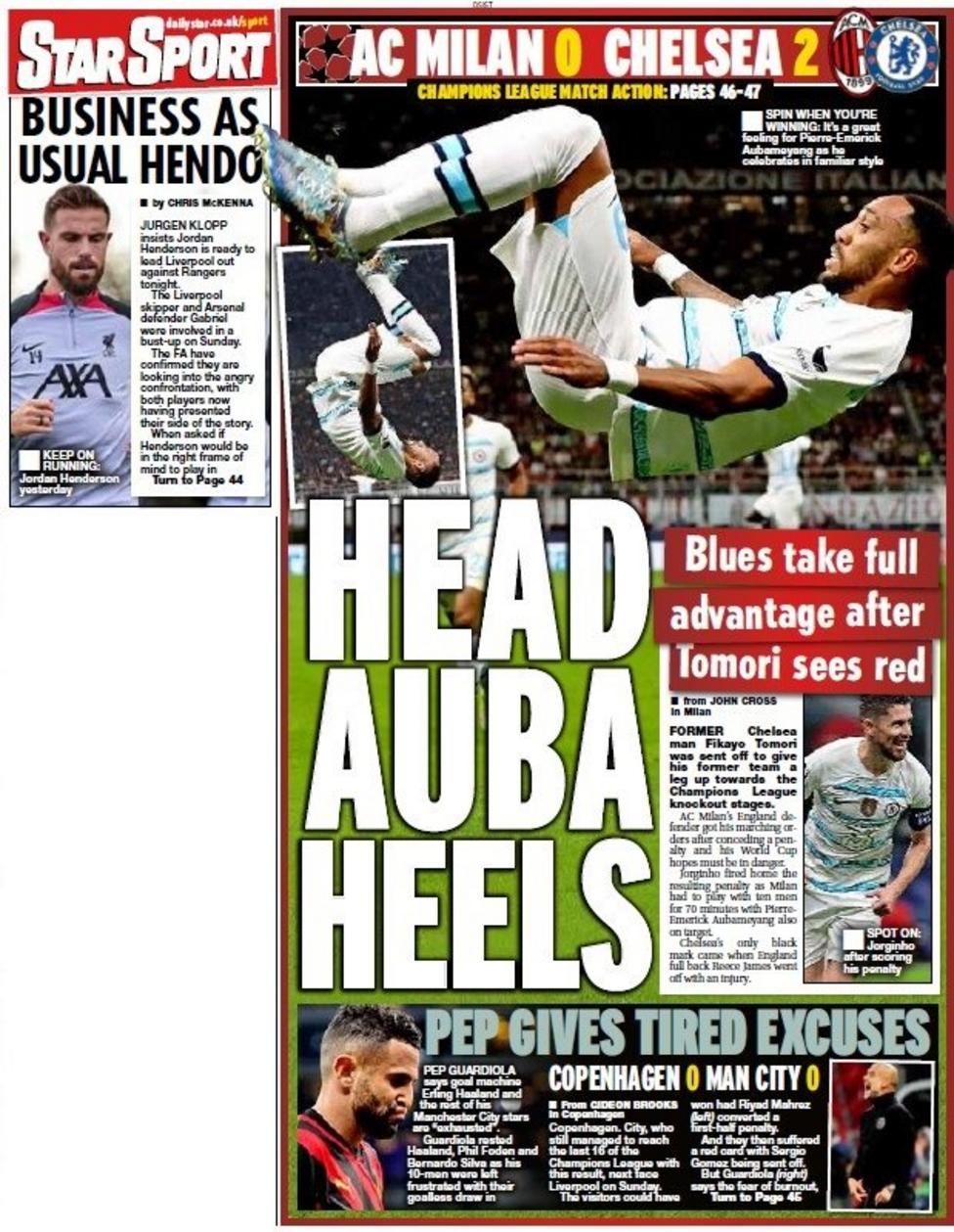 Sulle prime pagine inglesi di oggi, mercoledì 12 ottobre 2022, si parla della vittoria del Chelsea sul campo del Milan, con i Blues a un passo dalla qualificazione. Un gol di Jorginho su rigore e una rete dell'ex Aubameyang fanno volare la squadra di Potter. Non è andato oltre lo 0-0 il City in casa del Copenhagen, con Guardiola che ha risparmiato Haaland.