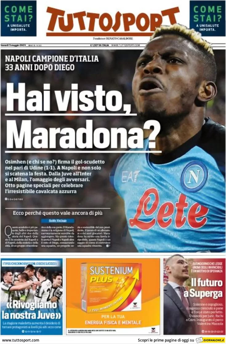 Monotematiche le prime pagine dei quotidiani sportivi (e non solo) questa mattina, com'è normale e giusto che sia. Il Napoli si è laureato Campione d'Italia per la terza volta nella sua storia dopo un campionato strameritato e condotto dall'inizio alla fine. I maggiori giornali hanno dedicato le loro prime pagine all'impresa dei ragazzi di Luciano Spalletti. La Gazzetta dello Sport ha scritto: "Napoli in Paradiso". Il Corriere dello Sport invece ha aperto con un perentorio: "Inchinatevi". Mentre Tuttosport ha giocato con la punteggiatura: "Hai visto, Maradona?"