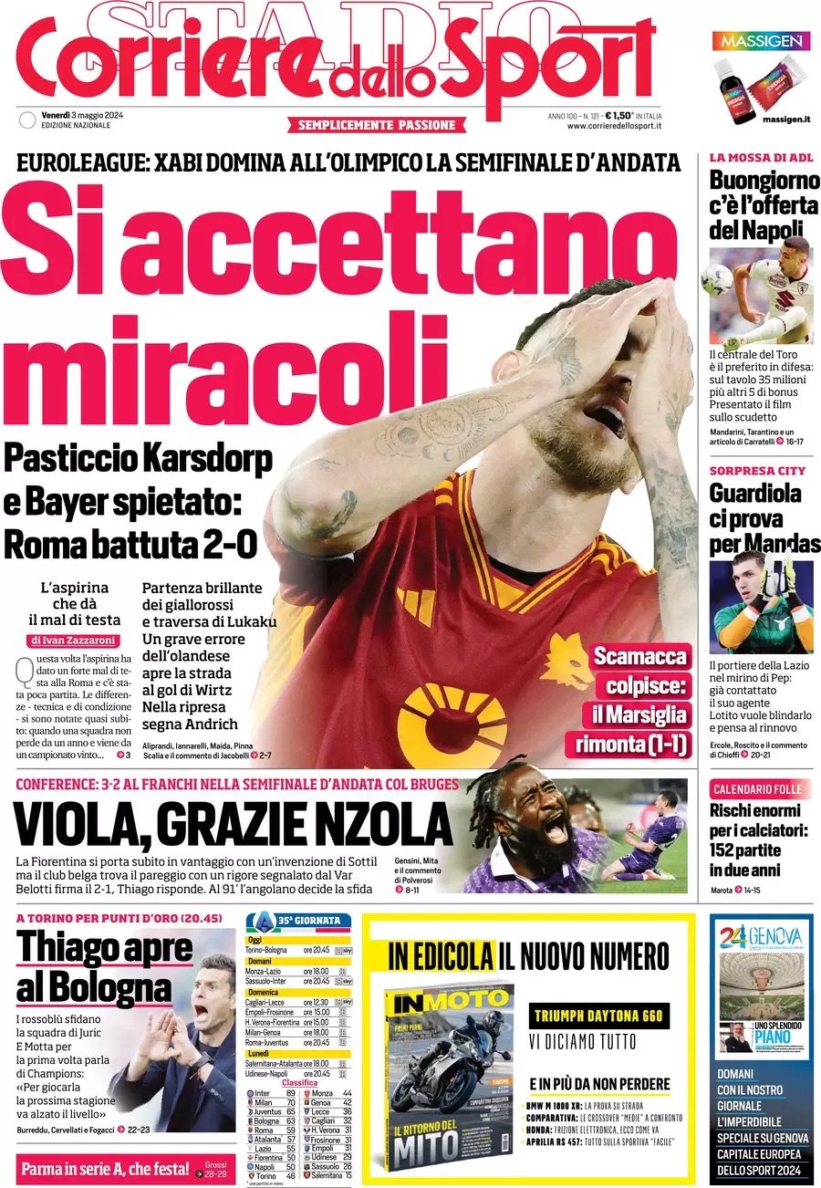 La Gazzetta dello Sport in taglio basso descrive la situazione legata a Julen Lopetegui. La rosea titola: "Il no del Milan brucia. Rabbia Lopetegui. Il tecnico era pronto a sostituire Pioli". In taglio laterale invece si parla di Zirkzee alla Juventus, un giocatore che interessa moltissimo anche al Diavolo: "I soldi per l'olandese da Soulè, Huijsen e Iling Jr". Sul Corriere dello Sport non si parla direttamente di Milan ma di Thiago Motta, uno degli obiettivi per l panchina: "Thiago apre al Bologna". Apertura a una possibile permanenza in rossoblù. Su Tuttosport non c'è nulla di interessante sul club rossonero, mentre il QS ragiona anche in ottica cessioni importanti e titola: "Leao incedibile. Ma gli altri eroi dello Scudetto? Maignan e Theo al bivio. In caso di offerte importanti possono partire".