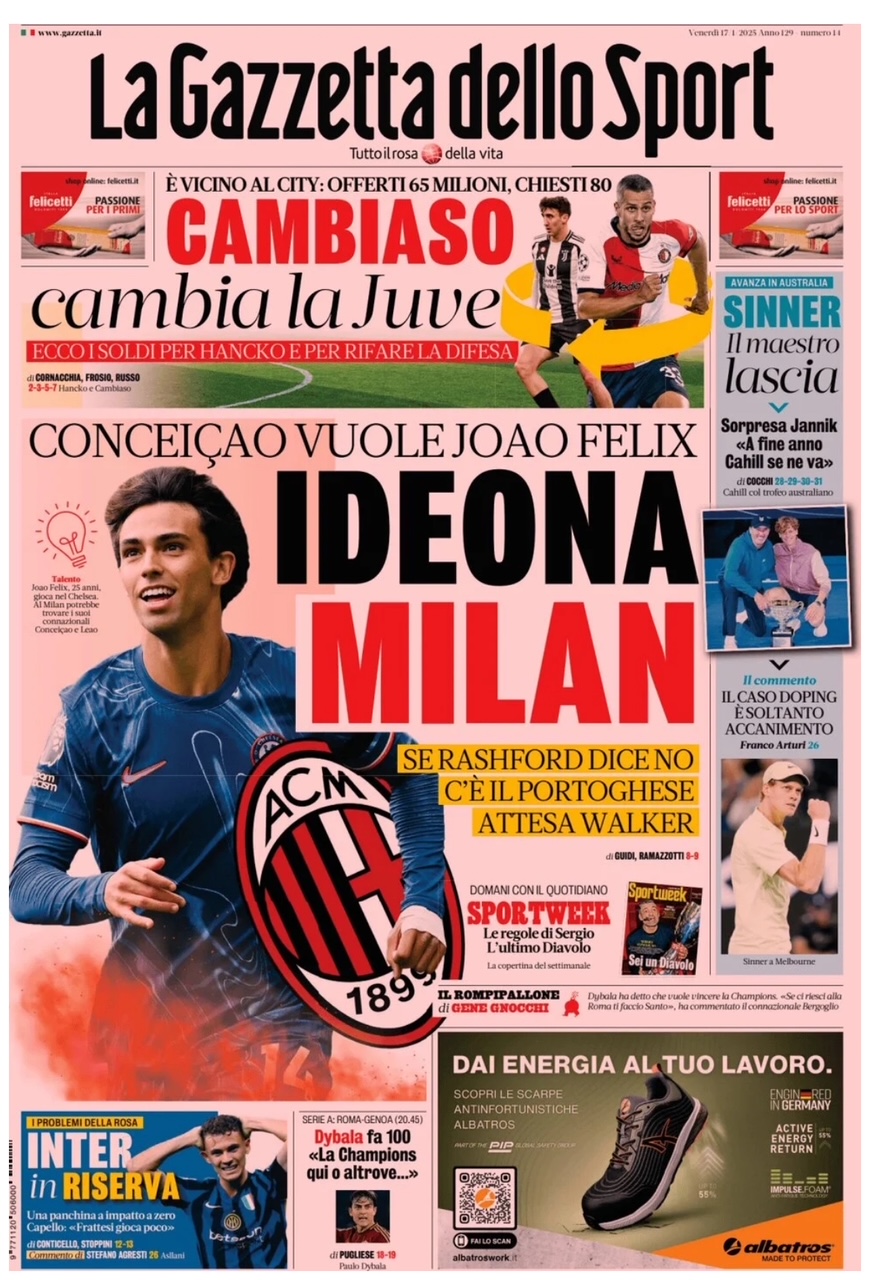 La Gazzetta dello Sport parla di mercato e anzi avanza un nuovo nome per il Diavolo: "Ideona Milan. Conceicao vuole Joao Felix". E poi nel sottotitolo viene aggiunto il legame con un'altra operazione al momento in standby: "Se Rashford dice no, c'è il portoghese. Attesa per Walker". Il Corriere dello Sport non fa nessun accenno al Milan, nè in ottica trattative nè per quanto riguarda il calcio giocato. Su Tuttosport, in taglio laterale, si parla invece di Tammy Abraham. Questo il titolo proposto: "Abraham, l'anti Juve che vede i fantasmi". Nel sottotitolo si legge: "L'eroe di Supercoppa domani sostituirà Morata: è in prestito e deve guadagnarsi la conferma, mentre Rashford incombe".