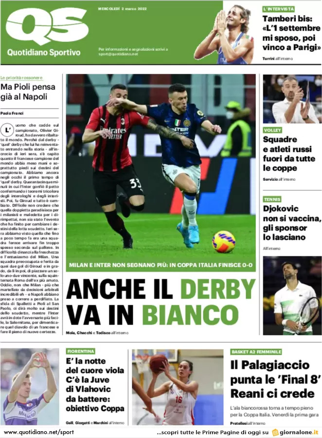 "Anche il derby va in bianco" è il titolo d'apertura scelto dall'edizione odierna del QS. Poche scintille nel derby di Coppa Italia, Milan e Inter non segnano più: finisce 0-0 il primo round a San Siro. Tutto in equilibrio in vista della sfida di ritorno, in programma a fine aprile.