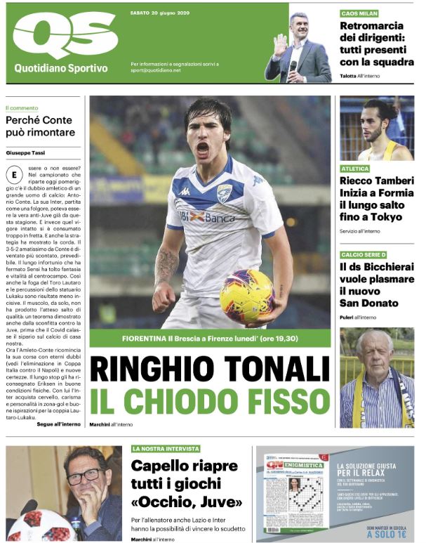 C’è spazio anche per le vicende del club rossonero sulla prima pagina dell’edizione odierna del QS, che parla di "caos Milan". Questo il titolo: "Retromarcia dei dirigenti: tutti presenti con la squadra". Il riferimento è alla visita di Gazidis, Maldini e Massara, che ieri si sono presentati a Milanello per assistere all’allenamento della squadra e fare il punto della situazione con Pioli. Un modo per ricompattare il gruppo in vista della ripresa del campionato.