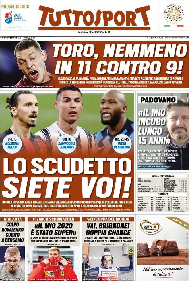 "Lo Scudetto siete voi". È il titolo che l’edizione odierna di Tuttosport dedica in prima pagina a Milan, Inter e Juventus, che stamane scenderanno in campo a distanza di poche ore una dall’altra. "Dopo la rissa tra Ibra e Lukaku (entrambi squalificati per un turno in Coppa) - si legge - e le polemiche per il blitz di Ronaldo in Val d’Aosta, oggi un super sabato di sfide a distanza tra le grandi rivali".