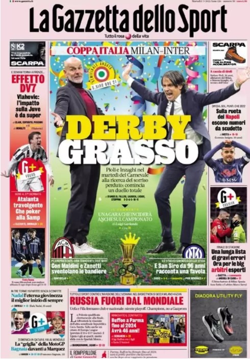 La Gazzetta dello Sport in edicola questa mattina dedica ampio spazio in prima pagina al derby di Coppa Italia tra Milan e Inter, in programma questa sera a San Siro. “Derby grasso”, titola la rosea, che poi aggiunge: “Pioli e Inzaghi nel martedì del carnevale alla ricerca del sorriso perduto: comincia un duello totale”.