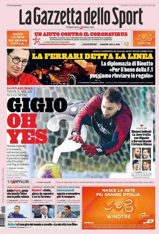 La Gazzetta dello Sport in edicola questa mattina dedica l’apertura a Gianluigi Donnarumma, il quale "tiene il Milan sulle spine", scrive la rosea. "Gigio, oh yes?", titola la Gazza, che poi aggiunge, sempre in prima pagina: "Studia inglese e lo mostra sui social: così, se non prolunga, il portiere riapre alla Premier o al Psg in futuro".
