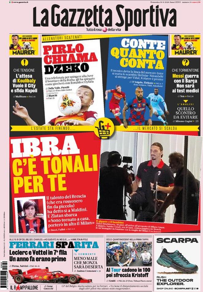 La Gazzetta dello Sport in edicola questa mattina dedica ampio spazio in prima pagina alla società milanista. "Ibra, c’è Tonali per te", titola la rosea, che poi aggiunge: "Il talento del Brescia (che è rossonero fin da piccolo) ha detto sì a Maldini". Nel frattempo, Zlatan è arrivato in Italia: "Sono tornato a casa, porterò in alto il Milan", ha dichiarato lo svedese.
