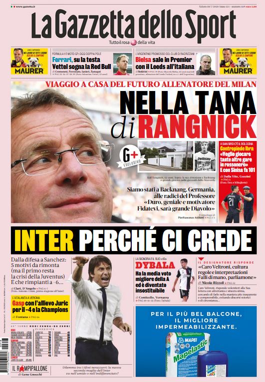 "Nella tana di Rangnick". È il titolo che La Gazzetta dello Sport dedica in prima pagina al manager tedesco. "Viaggio a casa del futuro allenatore del Milan - si legge - siamo stati a Backnang, Germania, alle radici del professore. 'Duro, geniale e motivatore. Fidatevi, sarà grande Diavolo'". La rosea parla anche di Ibrahimovic, premiato ieri a Milanello per le cento presenze in rossonero. "Contropiede Ibra: 'Voglio giocare tante altre gare in rossonero'. E con Sinisa fa 101".
