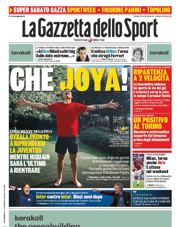 C’è spazio anche per il Milan sulla prima pagina dell’edizione odierna de La Gazzetta dello Sport, che pone l’accento sulla ripresa degli allenamenti da parte della squadra di Pioli. "Torna anche Ibra", titola la rosea, che poi aggiunge: "È atteso nel weekend". Come detto, i rossoneri hanno ripreso il lavoro in vista della possibile ripresa del campionato: "Subito in 14 a Milanello per svolgere le prime sedute individuali", scrive la Gazzetta di spalla.