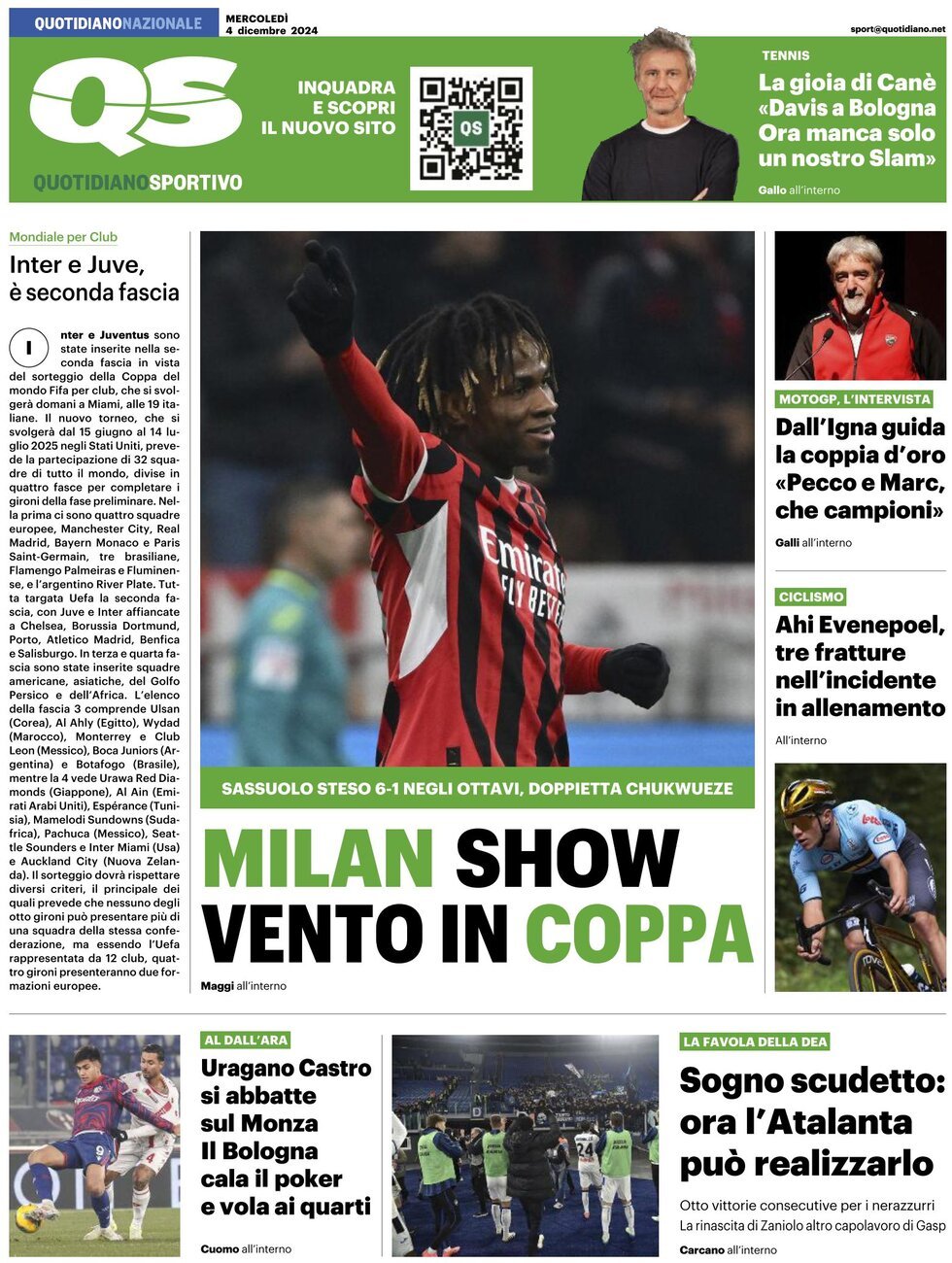 La Gazzetta dello Sport mette i rossoneri al centro questa mattina e titola così: "Diavolo a sei. Stramilan in Coppa Italia". Nel sottotitolo poi si legge: "Super Reijnders, anche Leao in gol. Sassuolo travolto 6-1 e Fonseca ai quarti. Avanti pure il Bologna: 4-0 al Monza". Il Corriere dello Sport in taglio alto e laterale riporta: "Il Milan travolge 6-1 il Sassuolo. Bologna, 4-0 al Monza: Orsolinin ko". Quindi c'è Tuttosport che in taglio basso recita: "Milan, gloria per tutti: e ora Gasp". Nel sottotitolo si legge: "A segno Chukwueze (doppietta), Reijnders (che rinnova), Leao, Calabria e Abraham: Roma o Samp nei quarti. Fonseca: segnali incoraggianti in vista del big match di venerdì". Infine c'è il QS che scrive così: "Milan show, vento in coppa. Sassuolo steso 6-1 negli ottavi, doppietta Chukwueze".