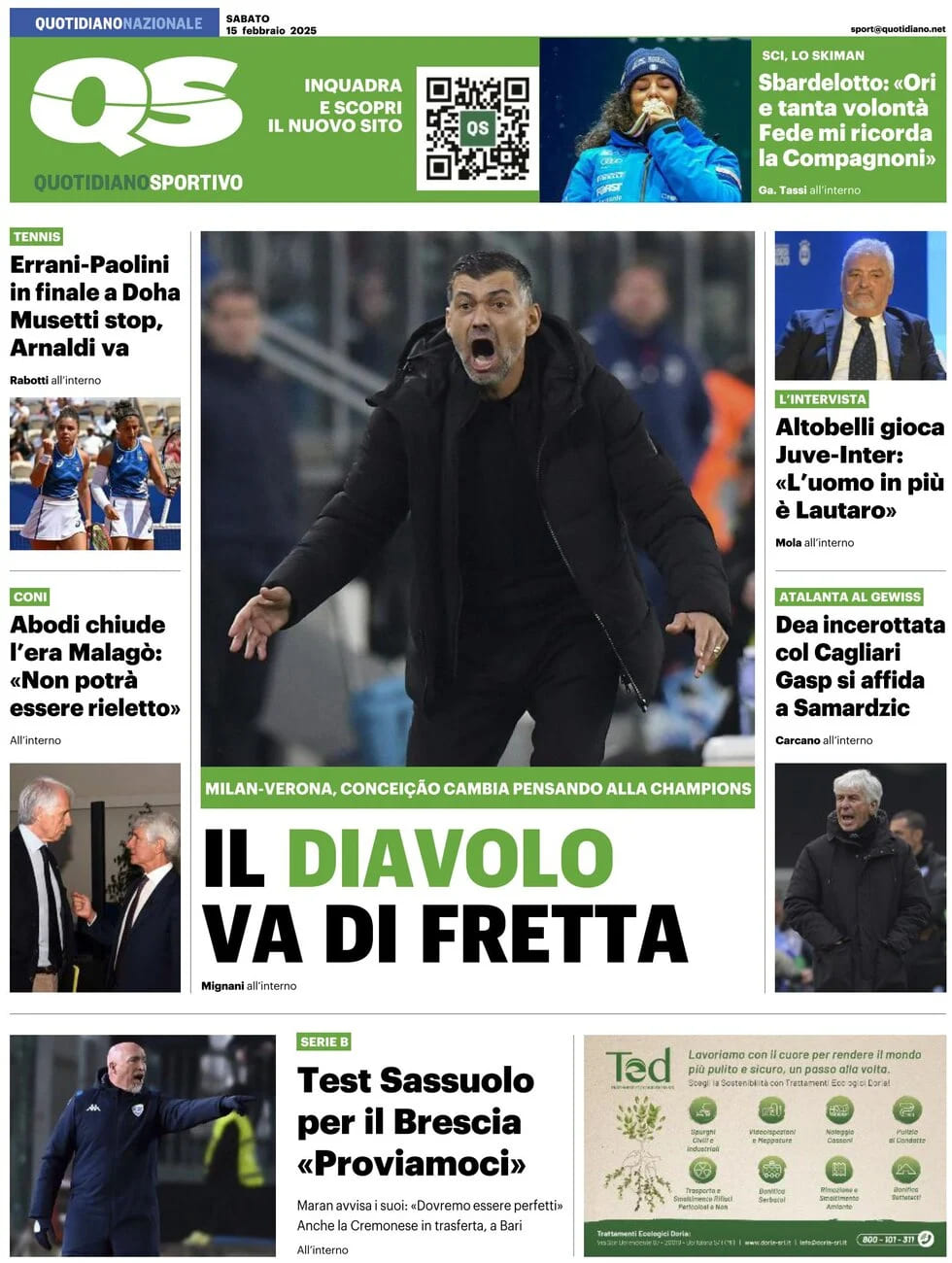 "Il Diavolo va di fretta" scrive oggi il Quotidiano Sportivo in apertura. Sergio Conceiçao pronto a cambiare ancora dopo la sconfitta dei rossoneri in Champions League contro il Feyenoord. Il tecnico del Milan pronto a cambiare formazione in vista della gara di campionato contro l'Hellas Verona, con un occhio all'Europa.