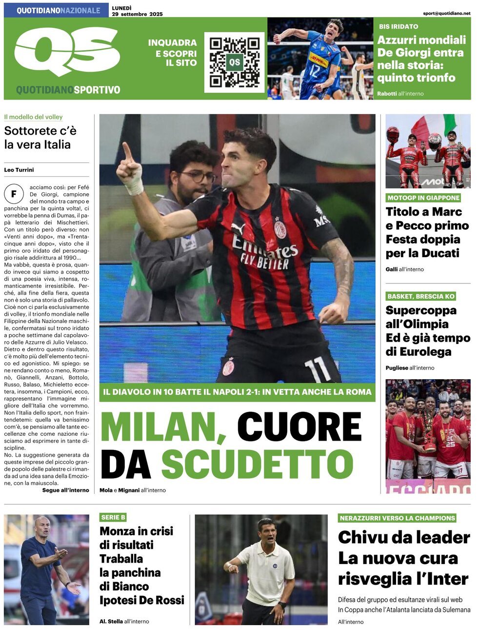 Il Quotidiano Sportivo in edicola oggi titola così: "Milan, cuore da scudetto". Grazie al successo per 2-1 di ieri sera contro il Napoli, arrivato dopo un primo tempo dominato e una ripresa di sofferenza dopo l'espulsione di Estupinan, il Diavolo ha agganciato gli azzurri in vetta alla classifica della Serie A dove c'è anche la Roma di Gasperini.