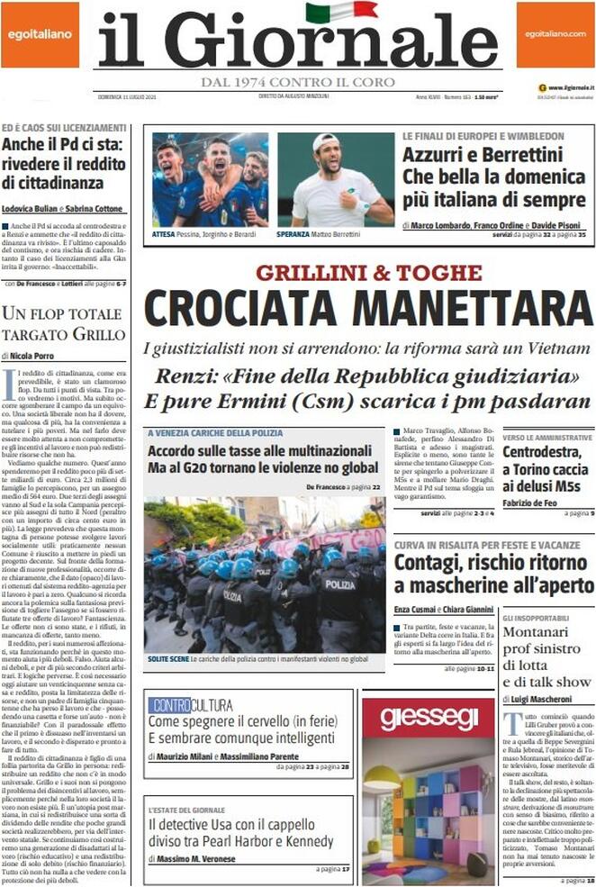 Anche i quotidiani non sportivi dedicano ampio spazio nelle rispettive prime pagine alla finale di Euro 2020 tra Italia e Inghilterra, in programma questa sera (fischio d'inizio alle ore 21) a Wembley. In primo piano anche l'atto finale del torneo di Wimbledon con la sfida tra il nostro Berrettini e il super campione Novak Djokovic.