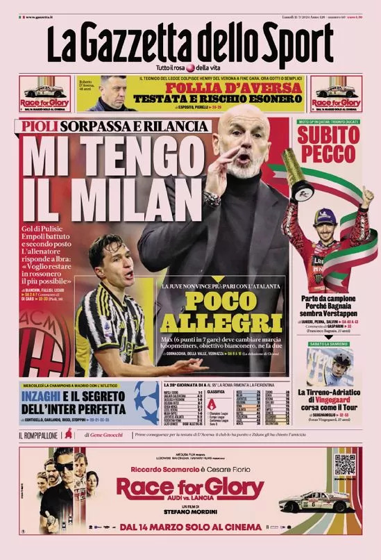 Il Milan ha messo la freccia sulla Juventus e ha operato il sorpasso. I rossoneri hanno vinto di misura, o di corto muso come si dice oggi, contro l'Empoli a San Siro, ripagando così della sua stessa moneta Max Allegri e scavalcandolo in classifica al secondo posto. Una magra consolazione che però lascia più sereni in vista del posto Champions e allo stesso tempo potrebbe portare il contentino della qualificazione alla prossima Supercoppa Italiana. Il campionato però è acnora lungo e ci sono troppe variabili in gioco: dal big match tra Juve e Milan che si giocherà a Torino, agli impegni europei che i rossoneri sperano di portarsi dietro il più a lungo possibile. Di seguito le prime pagine dei principali quotidiani sportivi usciti questa mattina in edicola.