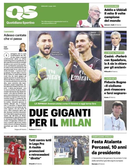 "Due giganti per il Milan". Questo il titolo con cui si apre l'odierna edizione del QS in edicola stamani in riferimento a Gianluigi Donnarumma e Zlatan Ibrahimovic. Il portiere verso il rinnovo con i rossoneri dopo le voci di mercato. Mentre lo svedese oggi torna per ulteriori visite dopo l'infortunio.