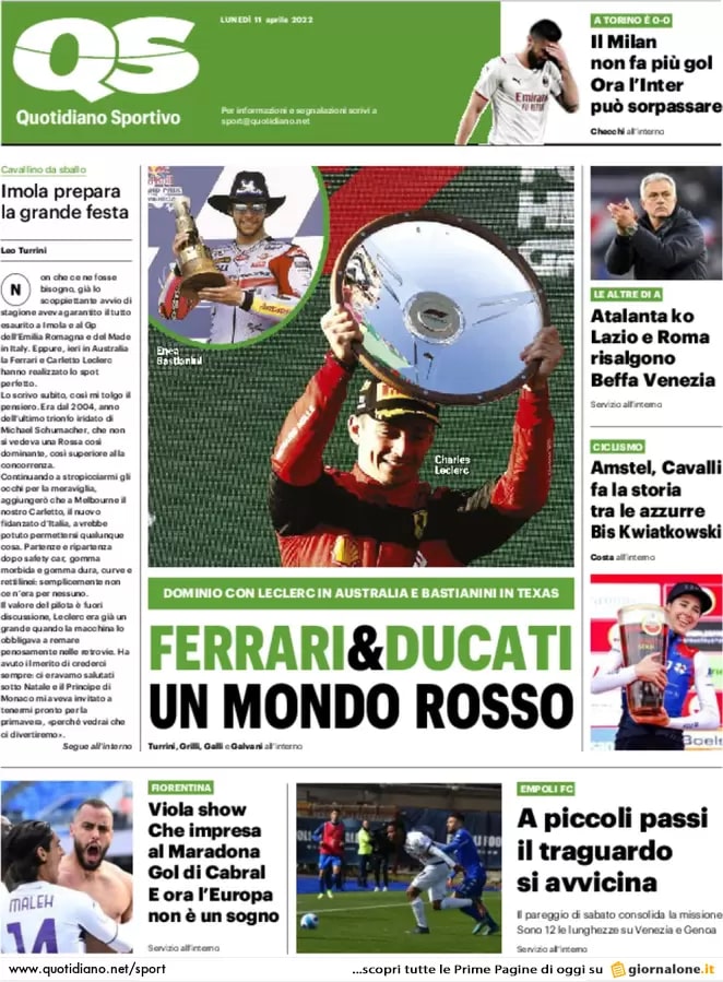 "Il Milan non fa più gol. Ora l'Inter può sorpassare" scrive il QS in prima pagina stamani. I rossoneri frenano in casa del Torino: 0-0 contro la squadra di Juric. Il Napoli invece è stato sconfitto da una grande Fiorentina al Maradona. Corsa Scudetto apertissima e incertissima. Ora tutto è nelle mani dell'Inter che è a -2 dalla capolista ma con una gara in meno.
