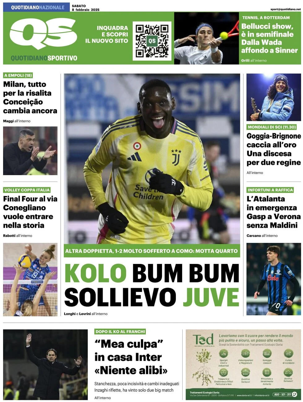 Il Quotidiano Sportivo titola così questa mattina: "Milan, tutto per la risalita. Conceiçao cambia ancora". Stasera contro l'Empoli, il tecnico milanista farà un po' di turnover visto che mercoledì è in programma la fondamentale trasferta di Champions League contro il Feyenoord. Rispetto all'ultimo match contro la Roma in Coppa Italia, il tecnico portoghese cambia quattro uomini nella formazione iniziale: Tomori e Pavlovic lasceranno il posto in mezzo alla difesa a Gabbia e Thiaw.