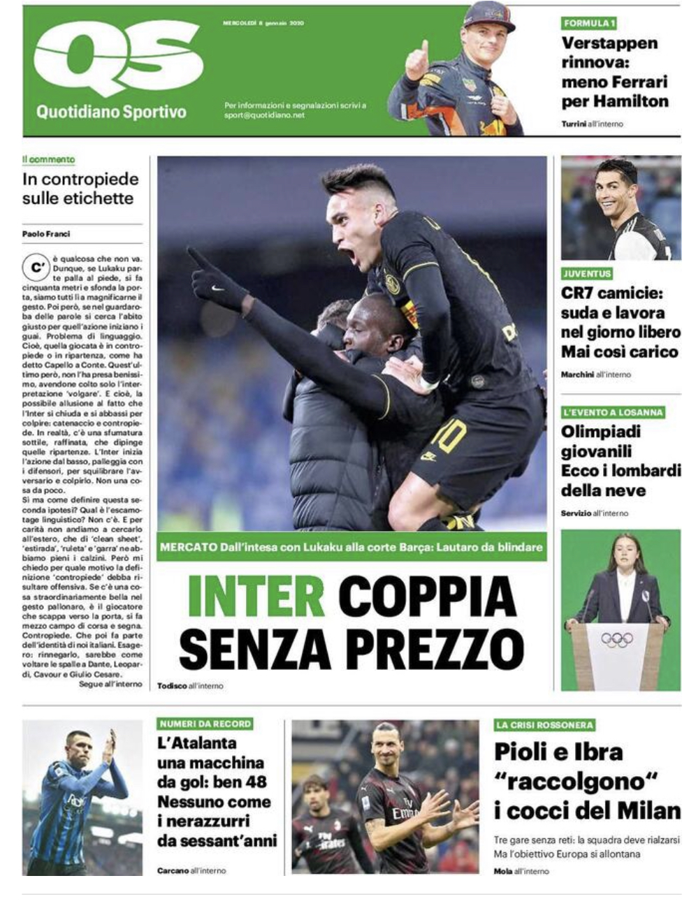 "Pioli e Ibra raccolgono di cocci del Milan": titola così questa mattina in prima pagina il Quotidiano Sportivo in merito alla crisi della squadra rossonera. La formazione milanista, che non segna da tre partite di fila, deve rialzarsi in fretta, anche se l'obiettivo Europa è sempre più lontano.