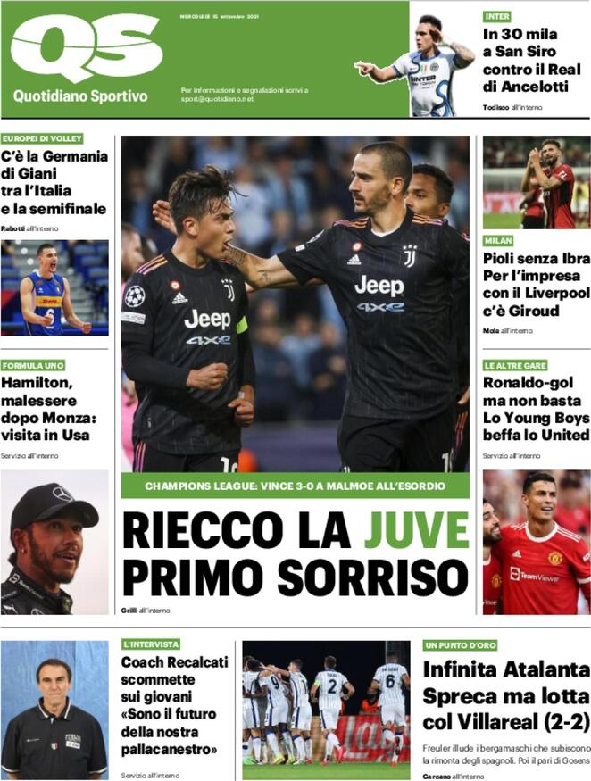 L'edizione odierna del Quotidiano Sportivo titola così stamattina sul Milan che stasera tornerà a giocare un match di Champions League dopo sette lunghissimi anni: "Pioli senza Ibra. Per l'impresa con il Liverpool c'è Giroud". Senza lo svedese, out per un problema al tendine d'Achille, i rossoneri si affideranno all'esperienza al centravanti francese che dovrebbe però partire dalla panchina (Rebic titolare).