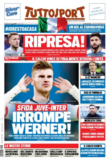 Anche il quotidiano Tuttosport, in prima pagina, pone l’accento sulla ripresa dei lavori per le squadre di calcio italiane, ma solo in alcune Regioni. "Ripresa!", titola il noto giornale sportivo, che poi aggiunge: "Via libera da domani agli allenamenti individuali in Emilia, Toscana, Lazio, Campania e Sardegna. Partono Sassuolo e Parma, poi toccherà al Bologna. Pronte Lazio, Roma e Napoli. Arriva l’ok anche di Spadafora".