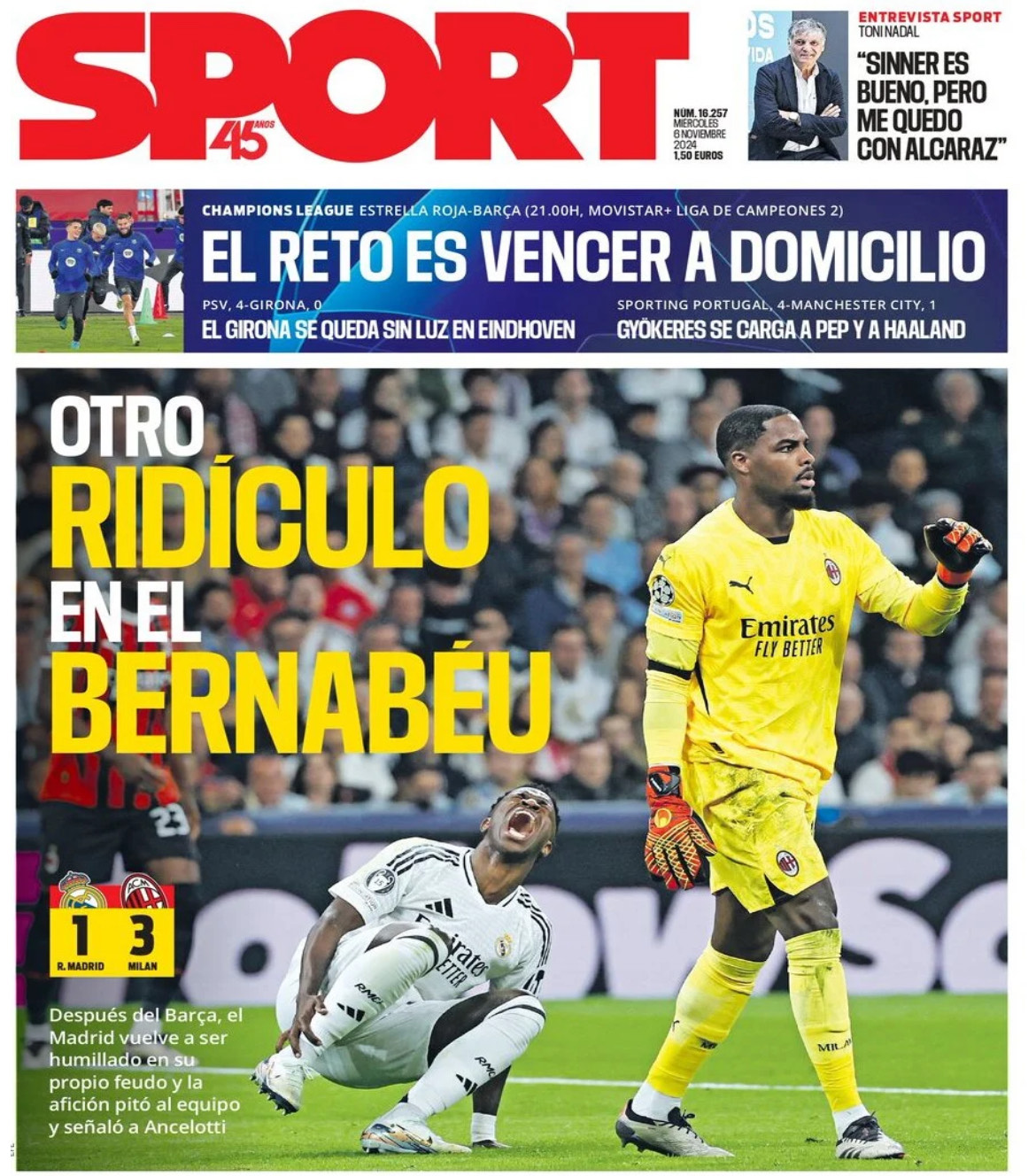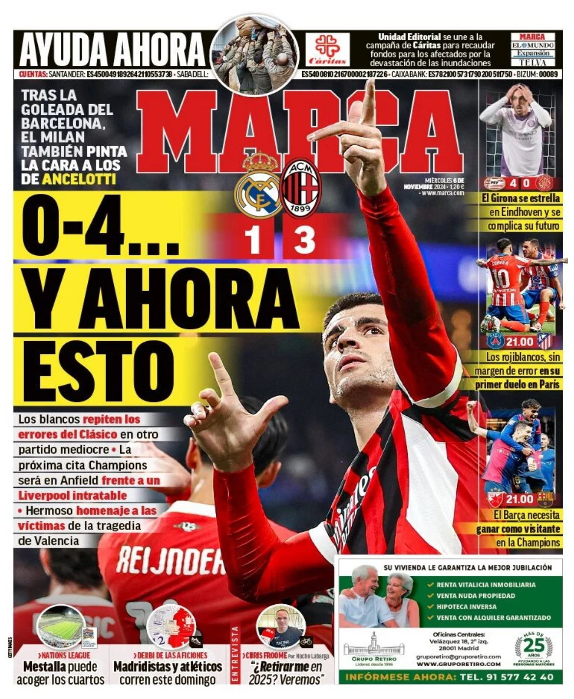 AS non usa, come spesso accade, mezzi termini e scrive: "Continua l'incubo". E poi si legge: "Il Madrid scivola anche in Champions League. Un Milan superiore lo fa cadere al 17esimo posto e con la trasferta di Anfield all'orizzonte. In gol Morata e Tchouameni fischiato". Anche Marca non perdona e titola riprendendo anche il collasso nel Clasico: "0-4 e ora questo. Dopo la goleada del Barcellona, anche il Milan dipinge il volto alla squadra di Ancelotti". Il Mundo Deportivo segue la stessa linea: "Altro ko. Il Bernabeu torna a vivere un'altra notte nera dopo quella del Clasico e si scatena la crisi". Infine la prima pagina di Sport che recita: "Altra beffa al Bernabeu. Dopo il Barça, il Madrid torna a essere umiliato sul proprio campo".